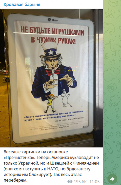 А конкретно - в Москве. О чём регулярно сообщает в своем Телеграм-канале. И вчера на остановке «Пречистенка», она заметила плакат о вступлении Швеции и Финляндии в НАТО. Собчак назвала это «весёлыми картинками» и пообещала, что «так весь атлас переберём»: