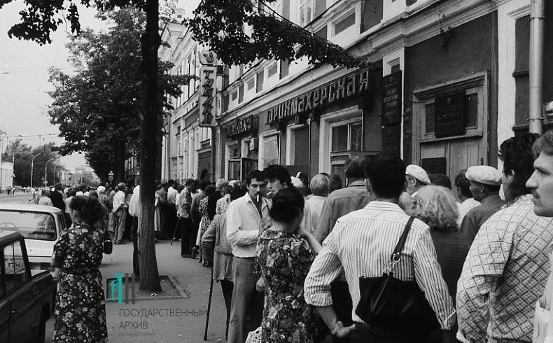 Очередь в магазин "Табаки" на улице Ленина г.Пермь, 14.08.1990г