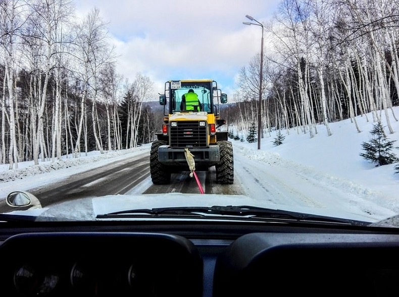 Если машина крепко увязла в сугробе или даже села брюхо, и своим ходом выбраться не представляется возможным, то придется выдергивать машину. Для этого надо перевести АКПП в режим «N», чтобы колеса могли свободно вращаться, а лучше включить её в положении «D» и немного подгазовывать, чтобы помогать тянущему.