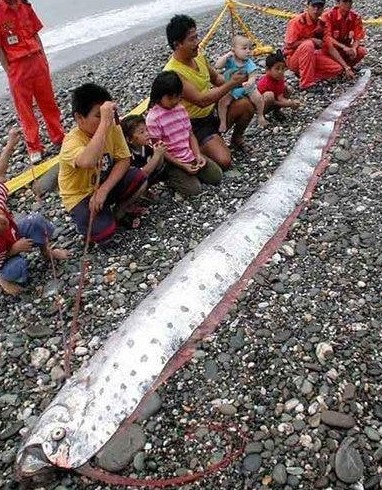 Рыба называется Сельдяной король. Считается, что если поймать её, то начнутся цунами, землетрясение и другие катастрофы.