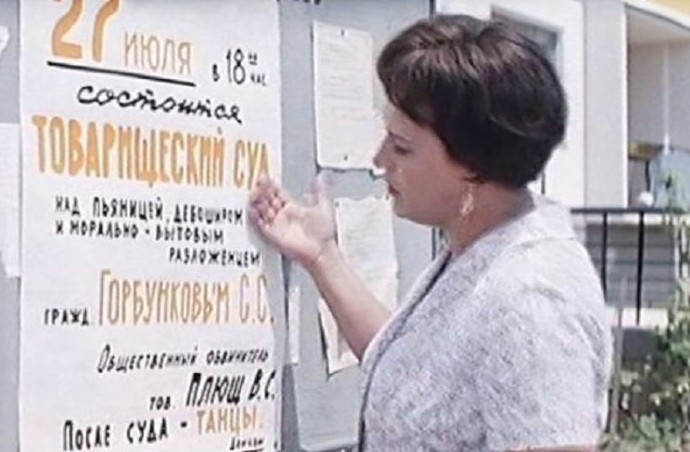 Кажется, такого рода суды существовали только в СССР. Их цель была сугубо воспитательная, и в них не рассматривались никакие дела, связанные с преступлениями, экономическими или уголовными. Зато к товарищескому суду можно было привлечь «оступившегося товарища», чье поведение не соответствовало представлениям о поступках и взглядах строителя коммунизма. В этот разряд попадали как нарушители трудовой дисциплины, хулиганы, лентяи или люди, слишком часто прикладывающиеся к бутылке, так и те, кто не хранил супружескую верность.
