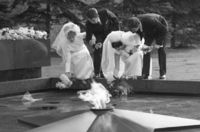В послевоенные годы появилась традиция в день бракосочетания посещать мемориалы погибшим в Великой Отечественной войне воинам или возлагать цветы к Вечному огню. Связано это было с тем, что в то время вступали в брак люди, пережившие войну. Возлагая цветы, они отдавали таким образом дань уважения. Некоторые молодожены вместо мемориалов воинам стали возлагать цветы к памятникам Ленину, стоявшим практически в каждом населённом пункте. В любом случае традиция эта соблюдалась много лет и была неотъемлемой частью прогулки жениха и невесты после ЗАГСа.