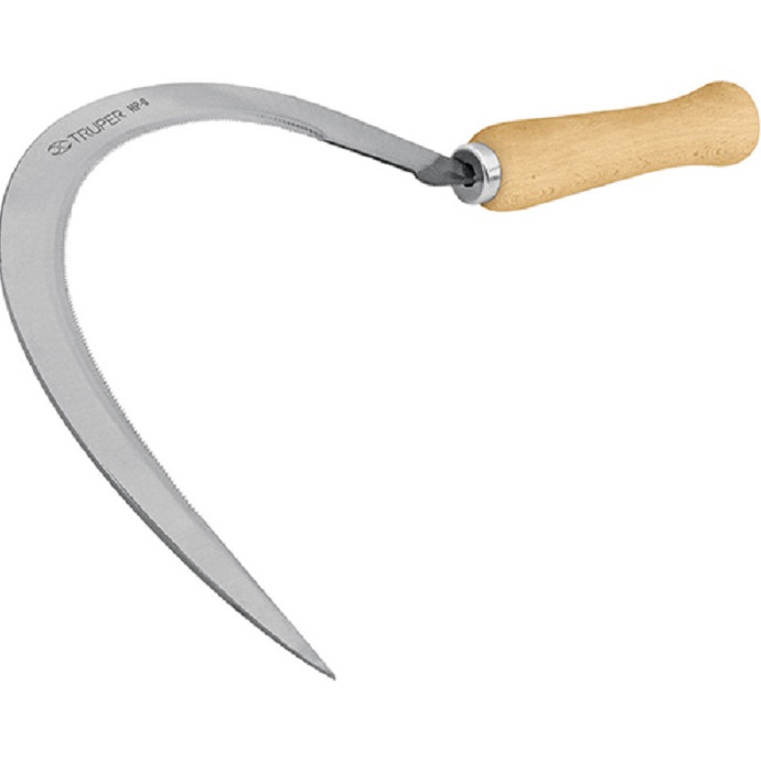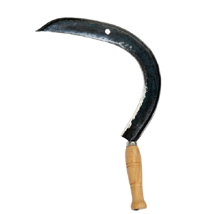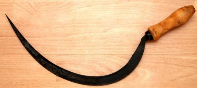 Есть версия, что художник рисовал серп с натуры, а для этой цели ему предоставили первый попавшийся экземпляр, который уже не мог пригодиться в хозяйстве и его не жалко было отдать. А рукоятка там для каких то целей была переставлена.